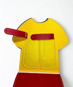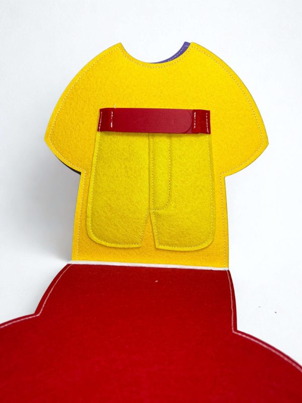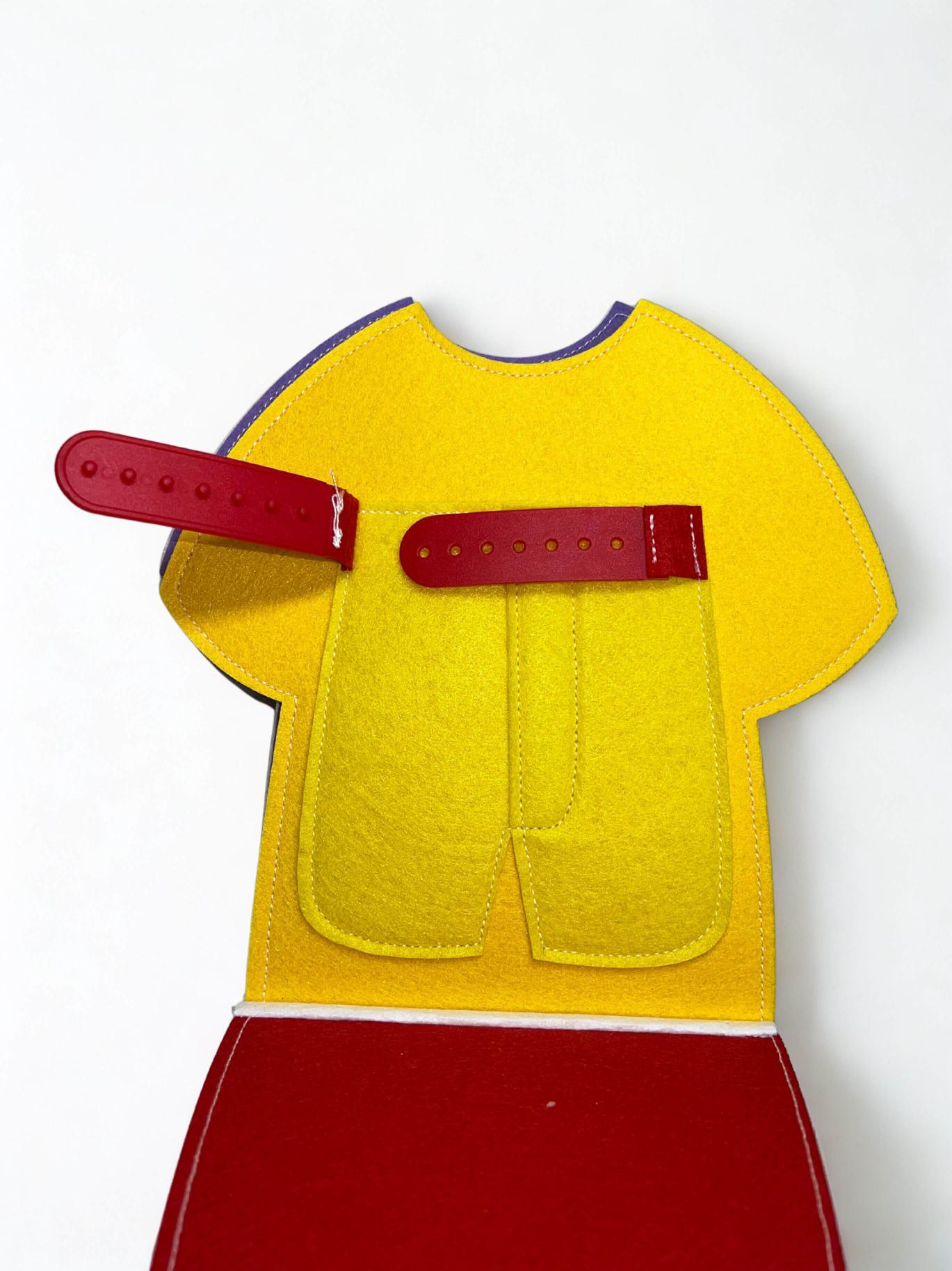 Žuti komplet s remenom: Na četvrtoj stranici dijete otvara i zatvara remen pomoću čička. Upoznaje jednostavan način zatvaranja, uči o slojevima odjeće i razlikovanju pojedinih dijelova outfita.
