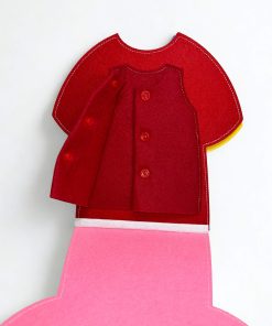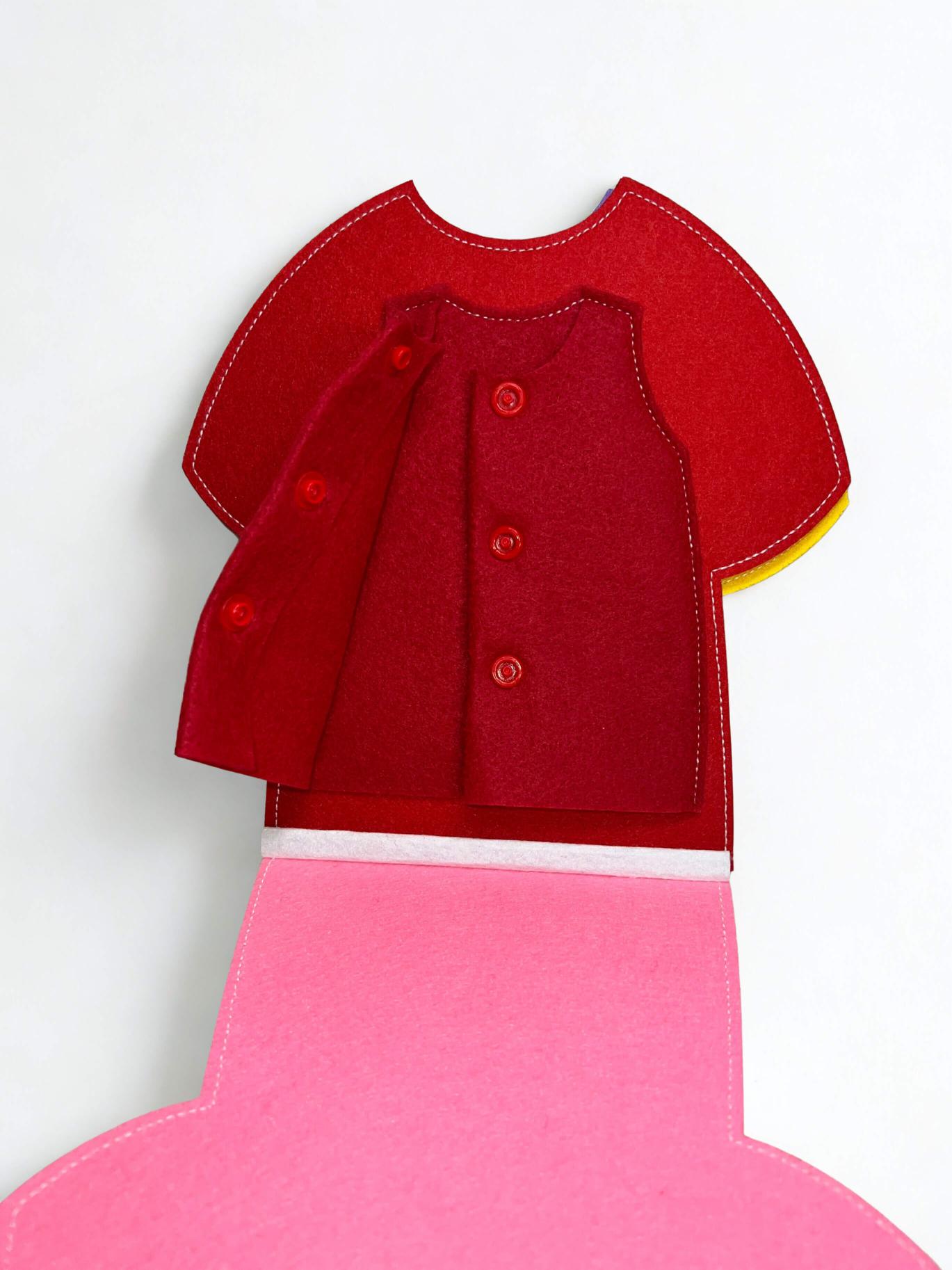 Povratak na osnovnu majicu: Na posljednjoj stranici dijete se vraća na prvi sloj — majicu s pregačom. Može ponovno kopčati i otkopčavati kopče ili mijenjati cijeli redoslijed oblačenja prema vlastitoj želji. Tako učvršćuje stečene vještine i stvara svoj vlastiti slijed slojeva odjeće.