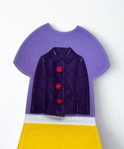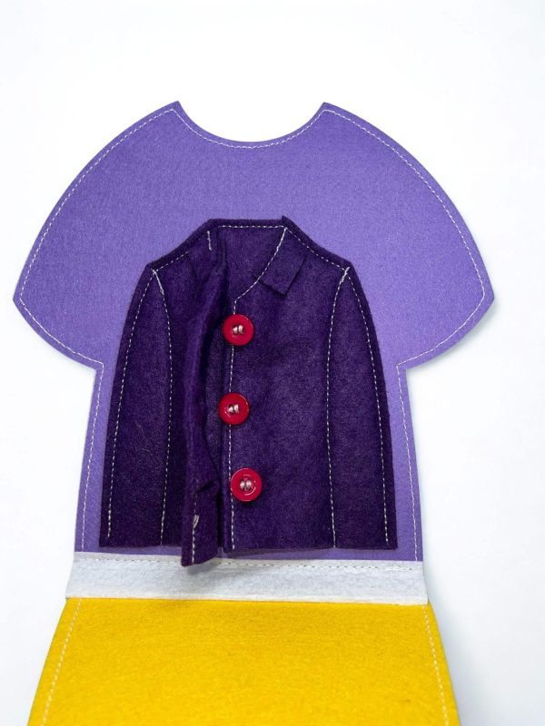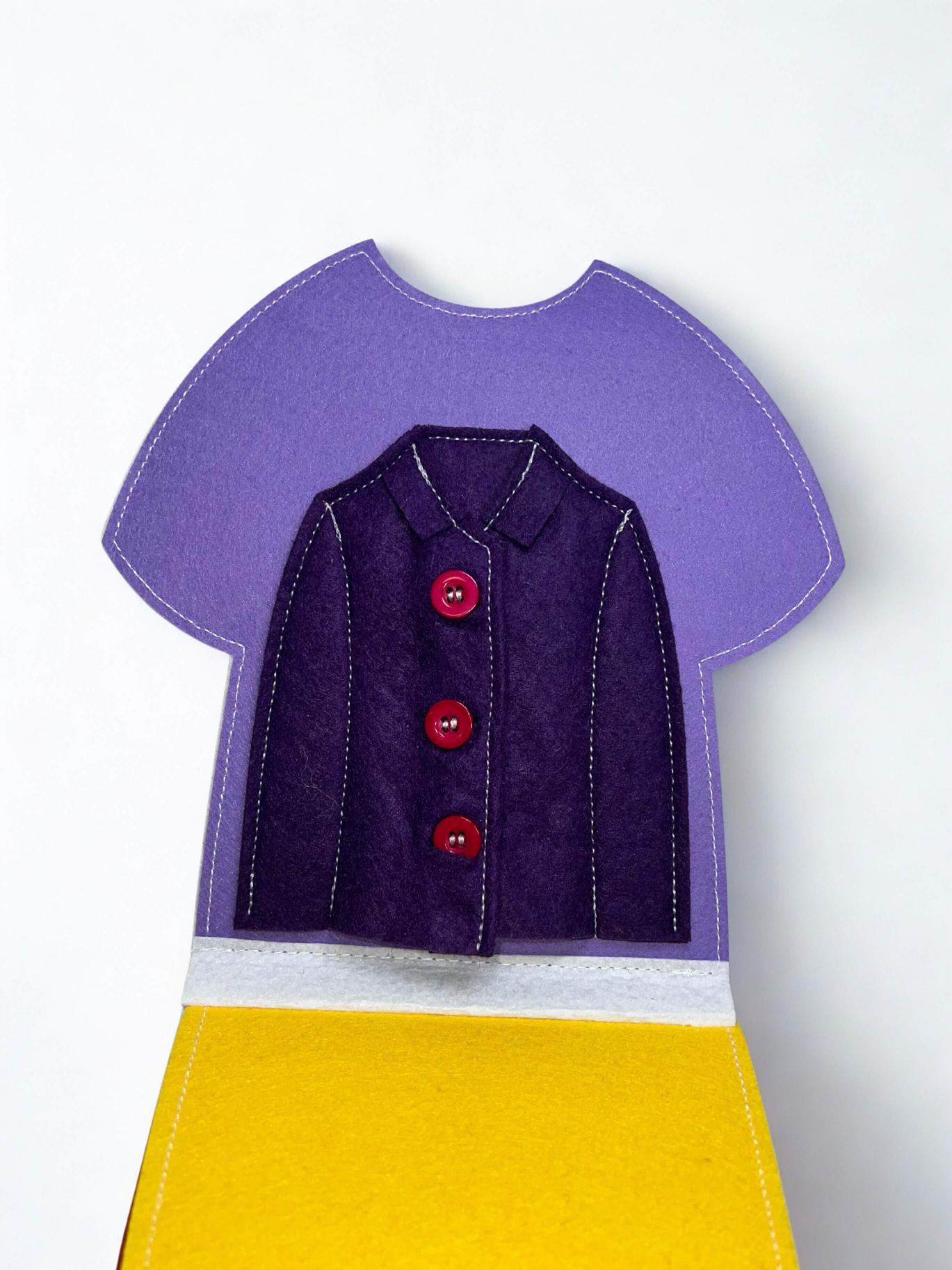 Ljubičasta jakna s gumbima: Petu stranicu čini ljubičasta jakna s pravim gumbima. Dijete ih zakopčava i otkopčava — jedna od najzahtjevnijih vještina za male ručice. Aktivnost snažno razvija finu motoriku, koncentraciju i samostalnost pri oblačenju.
