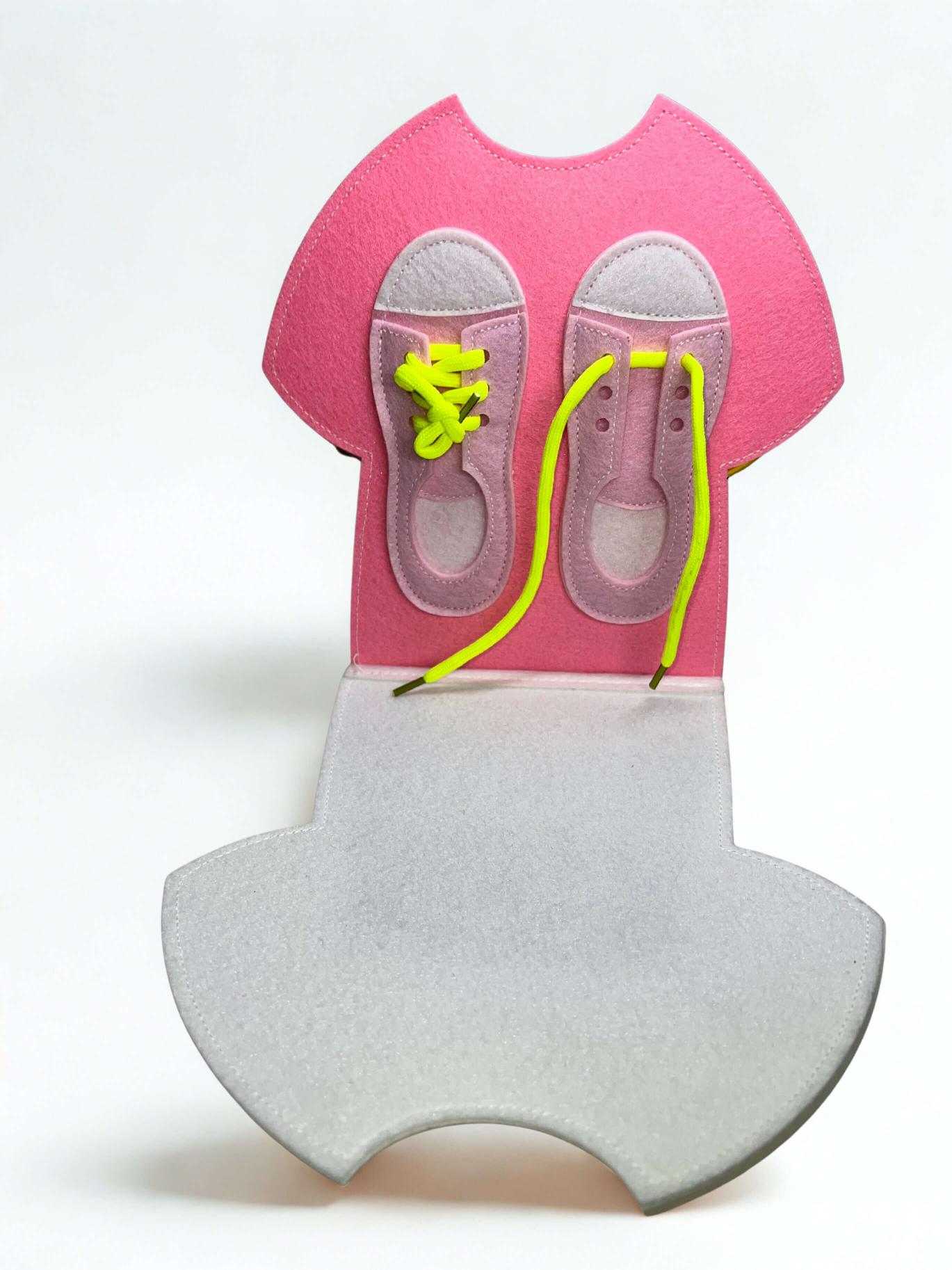 Cipele s vezicama: Na drugoj stranici nalaze se dvije cipele s vezicama na kojima dijete vježba vezanje, provlačenje i zatezanje. Ova aktivnost jača koordinaciju obje ruke, finu motoriku i logičko razumijevanje slijeda koraka.