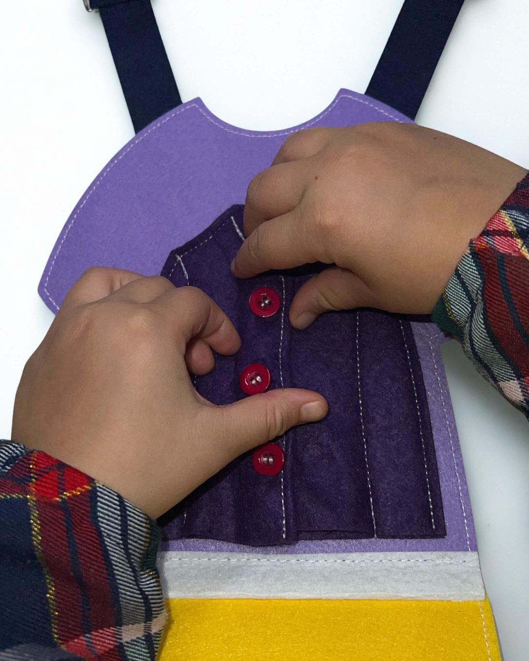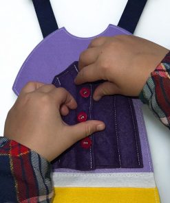Pregača s kopčama: Na prvoj stranici dijete otvara i zatvara dvije metalne kopče na pregači. Time vježba preciznost, snagu prstića i razumijevanje različitih mehanizama zatvaranja. Pregača predstavlja prvi sloj oblačenja i potiče djetetovu samostalnost.